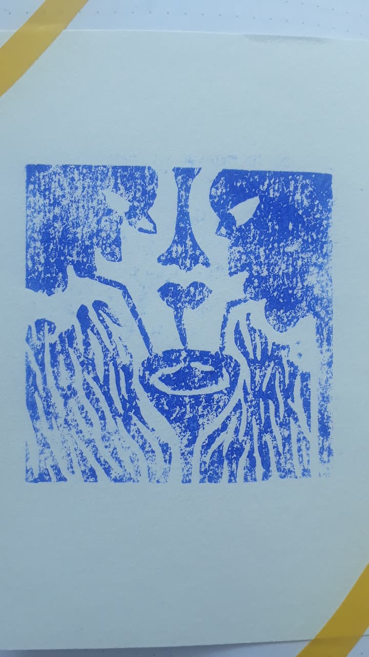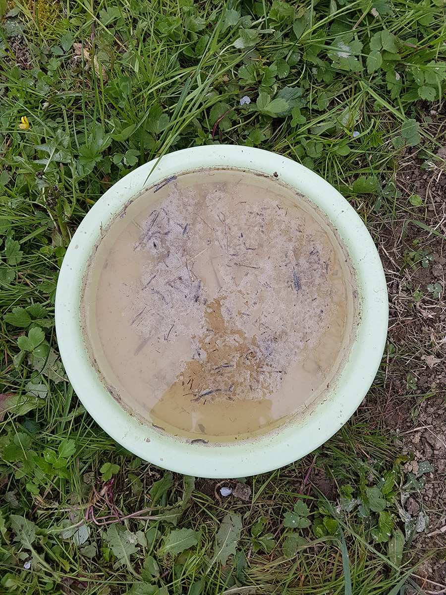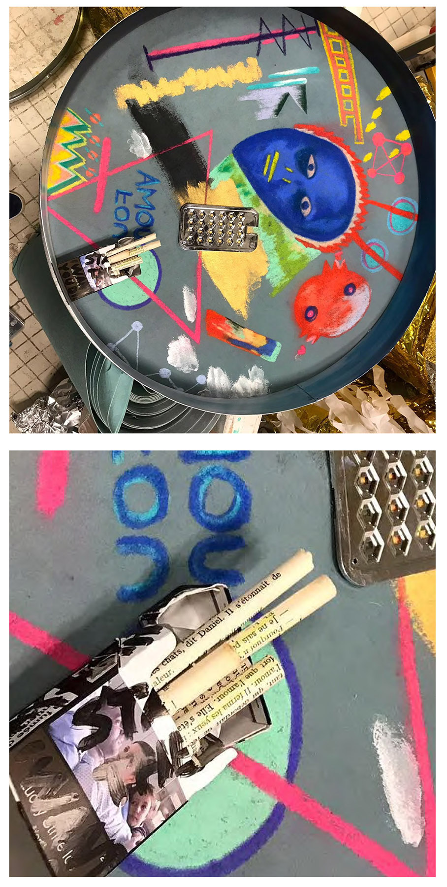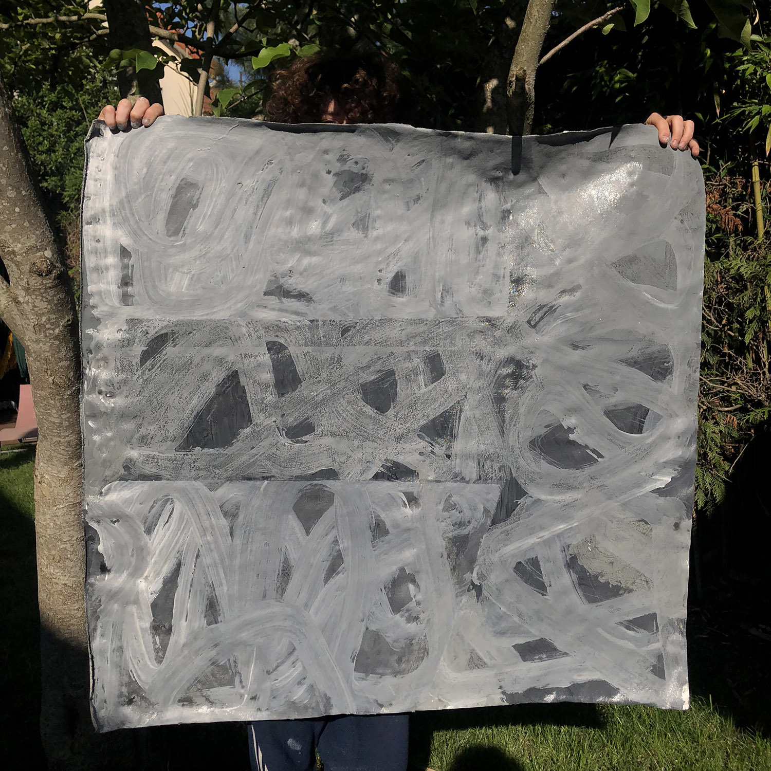 Pour marquer cette fin d’année inhabituelle, Gwendoline a fait de la pâte à papier à partir de vieux cahiers, notes et brouillons. Par la suite, elle a joué avec les formes et avec l’encre bleue, issue de la pochette de son ancien dossier scolaire de maternelle.