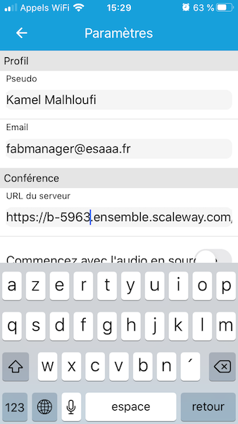 Si elle n’existe pas, elle sera créée pour vous. Vous pouvez dorénavant partager le lien de connexion de cette salle sous la forme https://b-5963.ensemble.scaleway.com/<nom de la salle>, soit https://b-5963.ensemble.scaleway.com/ESAAA-tuto dans notre cas.