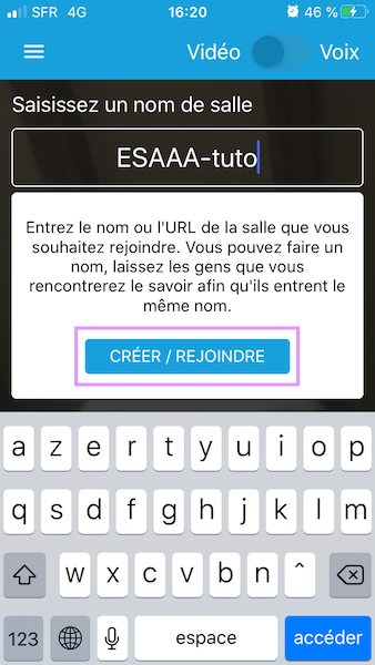 Sur l’écran d’accueil, entrez dans le champ le nom de la salle que vous souhaitez rejoindre ou créer, dans notre cas ESAAA-tuto, puis cliquez sur le bouton « créer / rejoindre ».