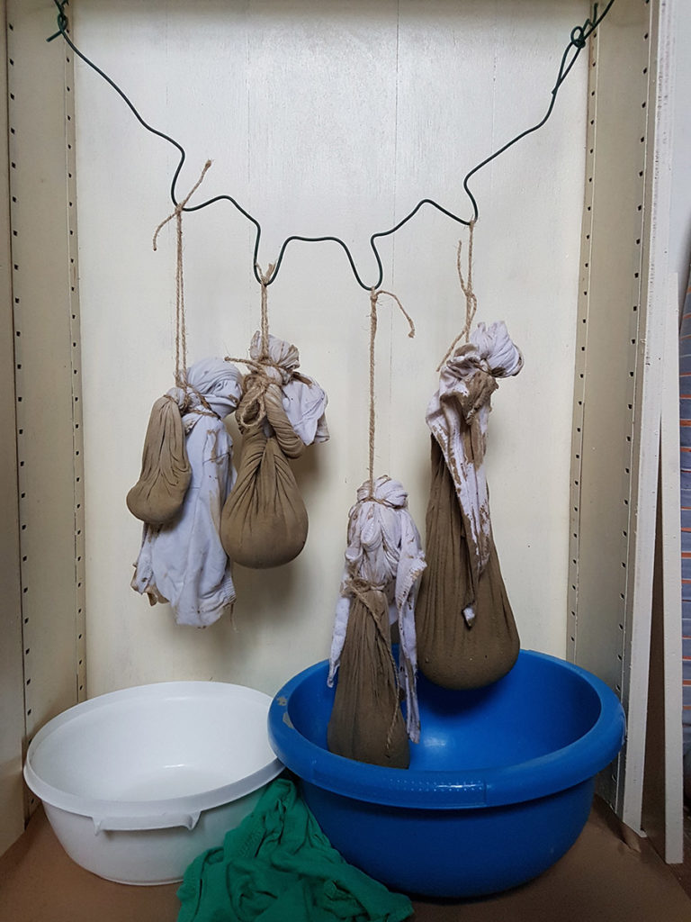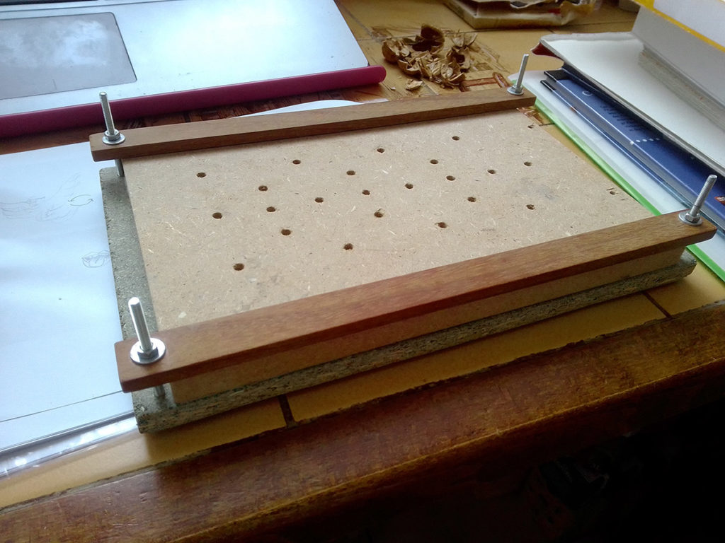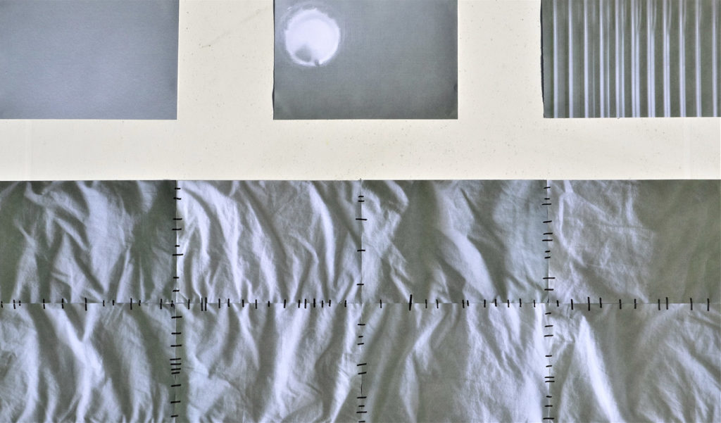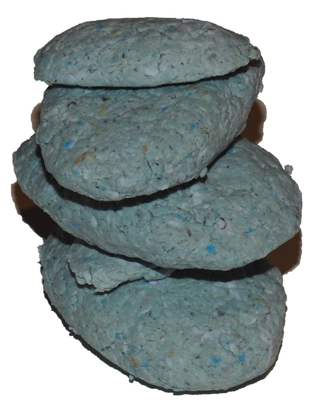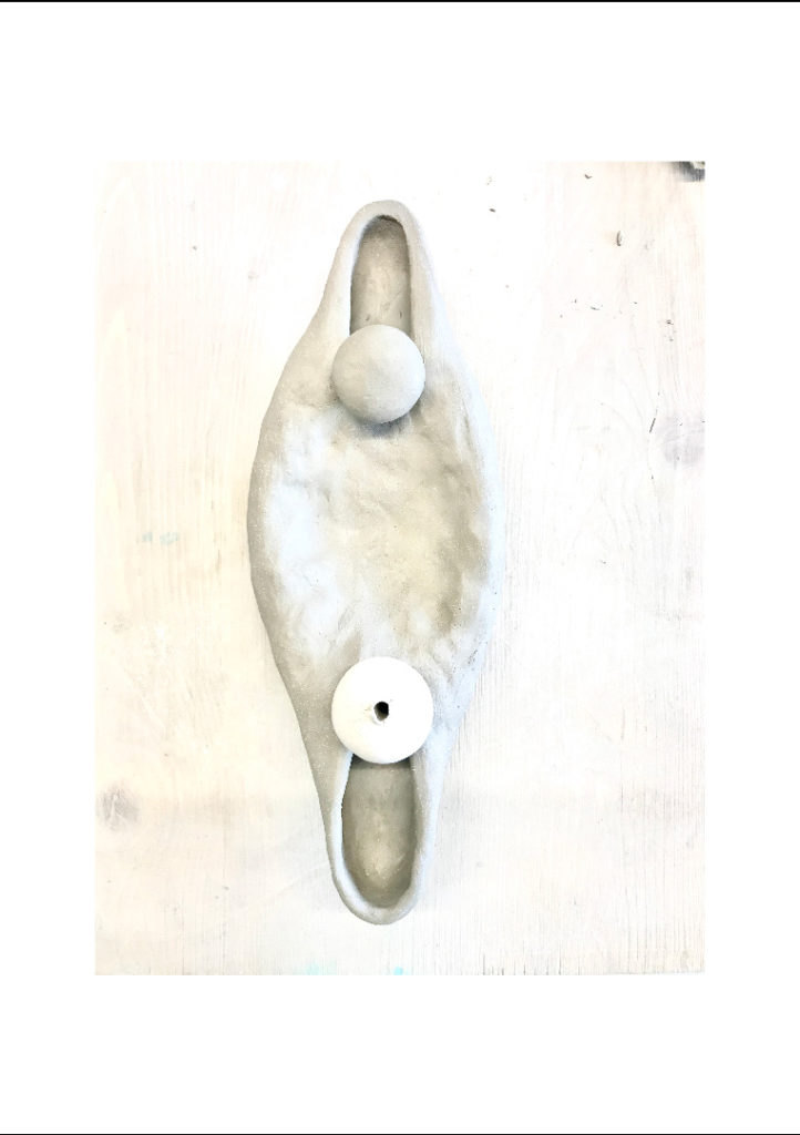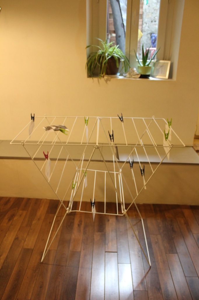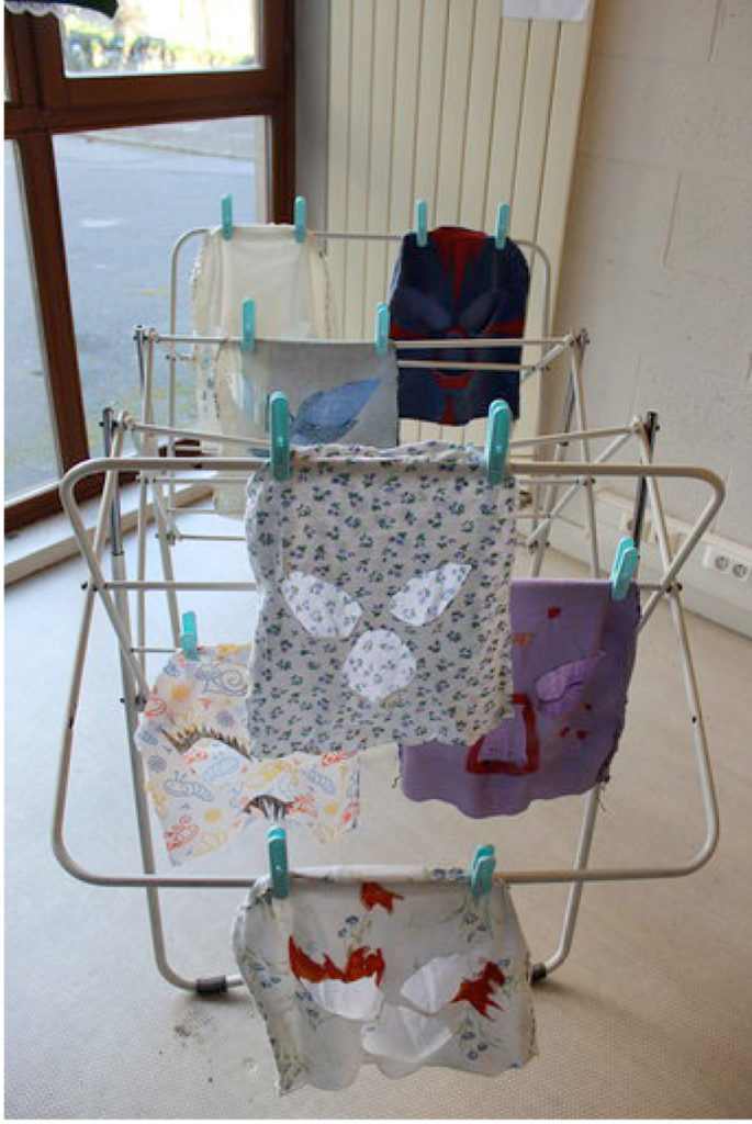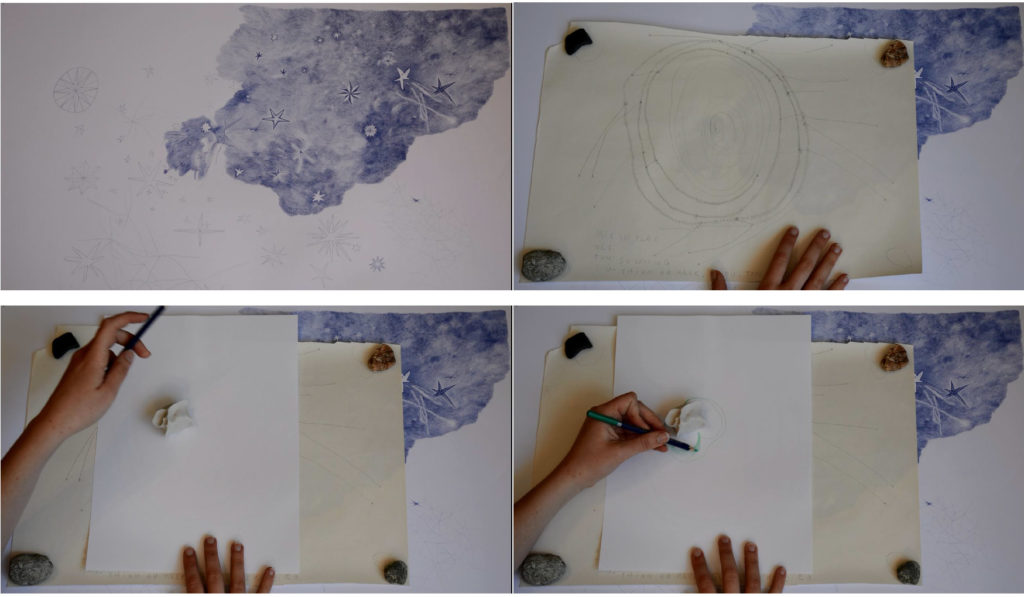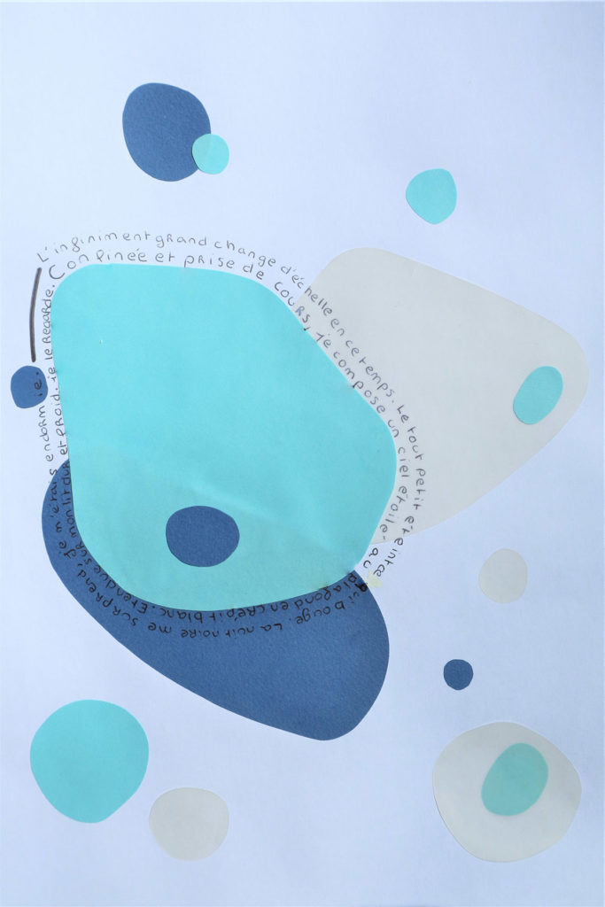 Pour marquer cette fin d’année inhabituelle, Gwendoline a fait de la pâte à papier à partir de vieux cahiers, notes et brouillons. Par la suite, elle a joué avec les formes et avec l’encre bleue, issue de la pochette de son ancien dossier scolaire de maternelle.